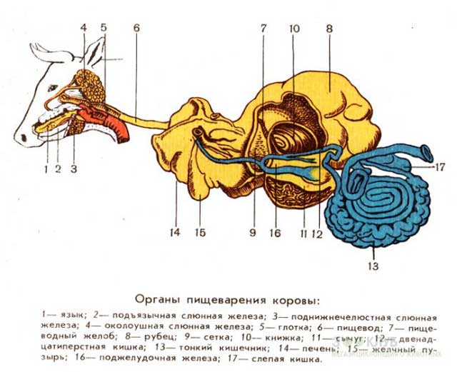 Правильне травлення корови сприяє швидкому засвоєнню їжі і насиченню організму поживними елементами. Шлунково-кишковий тракт (ШКТ) включає в себе ротову порожнину, глотку, стравохід, чотири камери шлунка, кишки. Також активну участь у перетравленні продуктів приймає печінку. Кормові маси рухаються з ШКТ зі швидкістю близько 4 м в добу. Завершенням всіх етапів є вихід переробленої їжі через анальний отвір.