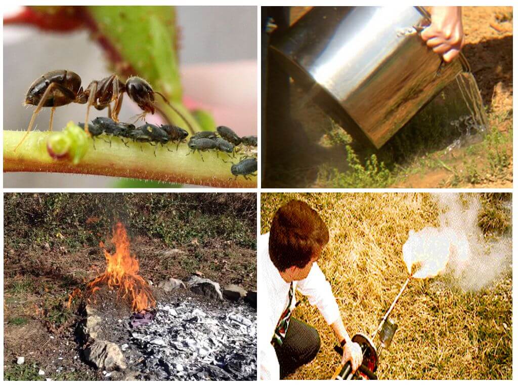 - Мурашник заливають відром кип’яченої води, розчином борної кислоти. Практикую спосіб підпалювання, якщо гніздо підноситься над землею. Обливають горючою рідиною, часто гасом, підпалюють. Краще це робити ввечері, коли всі робочі мурахи повертаються додому.