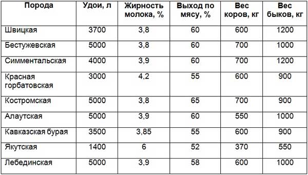 Практикуючі селекціонери і статисти зазначають, що в Росії традиційно затребуваність молочно-м’ясних порід корів вище. М’ясо-молочний худобу теж розводять, але ця гілка вимагає більше соковитих кормів. Нижче в таблиці ми об’єднали основні характеристики комбінованого напряму: