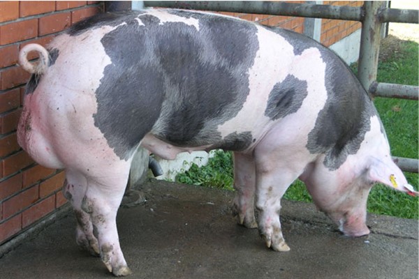 Тіло свиней має витягнуту форму, корпус міцний, шкіра рожевого кольору з невеликою щетиною. Особливість породи — вислоухость. Самці досягають ваги 300 кг.