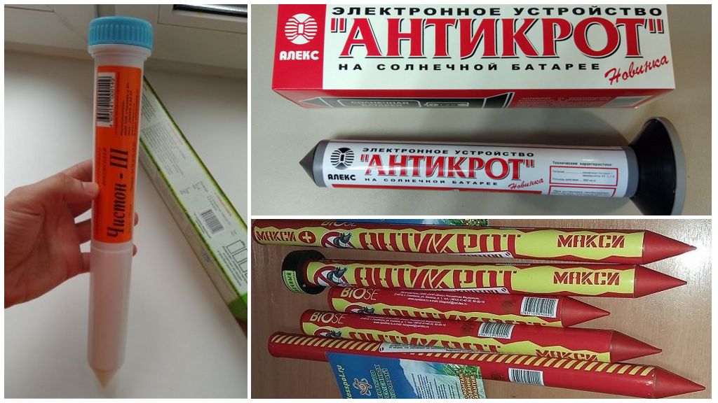 Антикрот і Антикрот Максі – відлякувачі, що діють на кротів і гризунів за допомогою генерування коливань низької частоти, мають пластиковий корпус, працюють на 2-3-х батарейках. Встановлювати необхідно в грунт. Ефективна площа дії: до 800 кв. м. Ціна 640-770 руб.