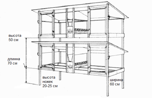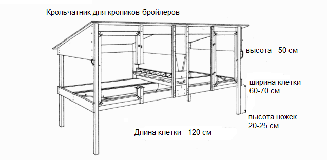 У клітці розміром 70х60х50 вільно поміститься 3 дорослих кролика або самка з кроленятами. Для бройлерних кроликів порід відмінно підійде крільчатник побільше з розмірами 120х60х50. Висота задньої стінки менше на 0,5-1 см. Для клітин, які розташовані на вулиці, потрібно передбачити високі ніжки розміром не менше 20-25 см. Це значно полегшить догляд за тваринами і захистить їх від небезпечних гризунів.