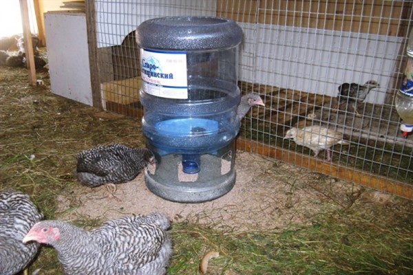 Годівницю можна виготовити навіть з пластикової каністри. Для цього необхідно вирізати почекальню частина. Усередину насипати корм і повісити її за ручку. Слідкуйте за тим, щоб каністра була на висоті, так курям буде, зручніше їсти.