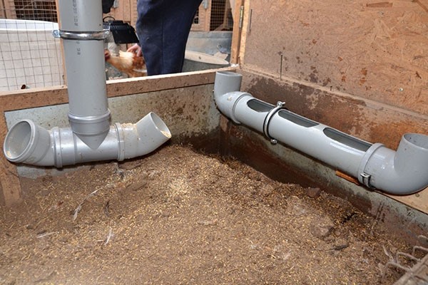 На одній трубі слід вирізати кілька отворів – вони необхідні для подачі корму. З однієї сторони труби вставити заглушку, на інший коліно. Годівниця готова. Добре прикріпіть її в курнику. Її системи роботи проста – вертикальна труба наповнюється кормом і закривається заглушкою. Після того, як корм знизу з труби буде з’їдений, кури отримають нову порцію. Досить наповнювати годівницю лише раз на добу.