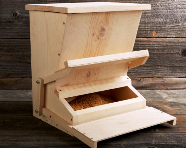 - Дерево. Використовувати дерев’яну годівницю необхідно тільки для сухих кормів, крейди і мінеральних добавок. Від сирих продуктів дерево розбухне, і годівниці прийдуть в непридатність.