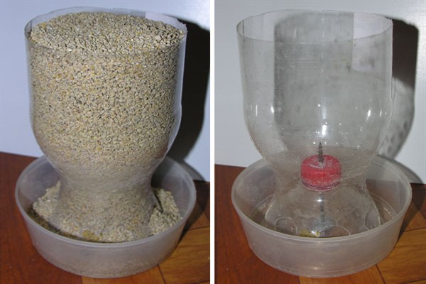 Придбайте в магазині лише спеціальну мисочку для птахів і тварин, розділену на секції для корму чи води і приготуйте пластикове відро.