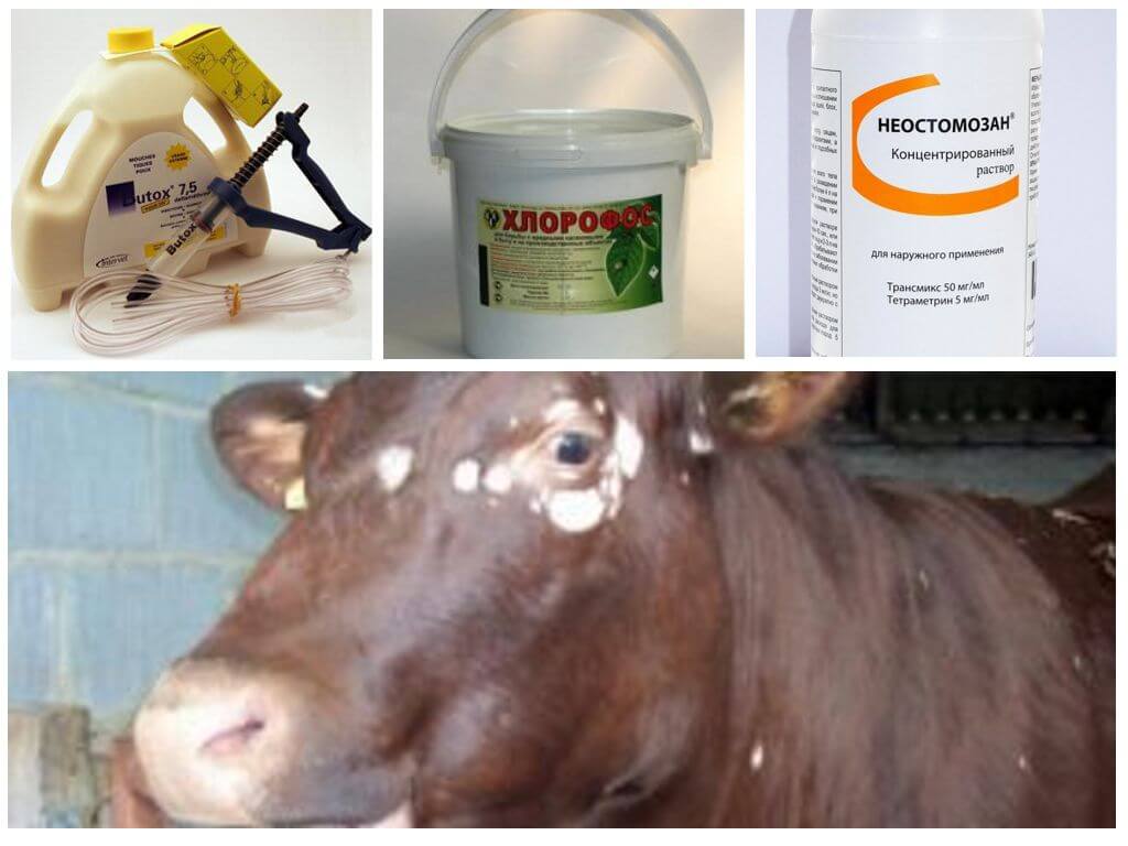 - 0,5% розчин хлорофосу. Обробляють хребет, голову, шию, область навколо хвоста. Дія хлорофосу сильний, але нетривалий. Вбиває німф, імаго. Втрачає чинність протягом доби.
