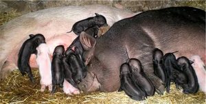 - Малюків звільняють від слизу, обробляють пуповину поросят і обсушують, після чого підкладають до свиноматці, для годівлі молозивом.