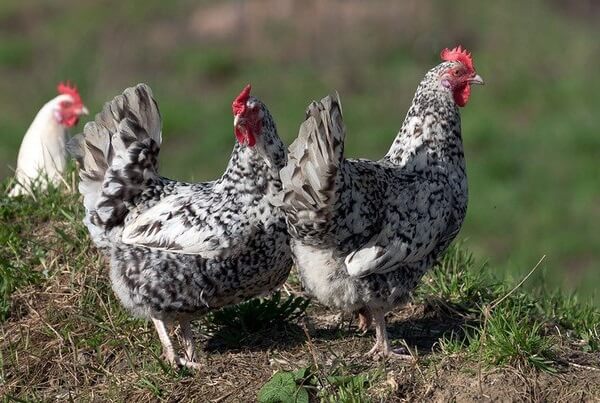 Півні зазвичай білі з чорними плямами.