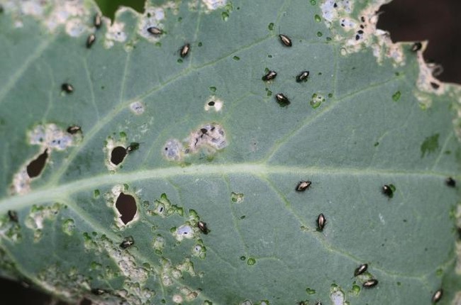 Зовнішній вид капустяного листа, який атакували хрестоцвіті блішки