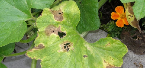 Антракноз – хвороба, що проявляється утворенням на сухих листках, коричневих плям. Вони схильні до розростання, а по мірі прогресування хвороби у центрі плями з’являється отвір, як це видно на фото. За спостереженнями городників, антракноз провокує полив методом зрошення. Якщо поливати кабачки під корінь, то виникає хвороба значно рідше. Обробка 1% бордоською рідиною або іншим фунгіцидом – ефективна міра боротьби з збудником.