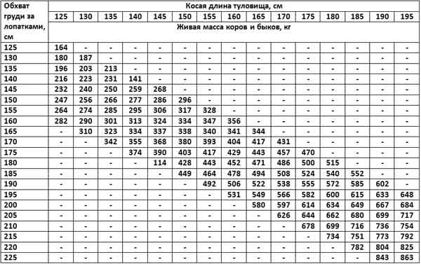 Даний метод дозволяє визначити середній вага корови чи бика в більш дорослому віці. Щоб скористатися таблицею, вам теж потрібно визначити обсяг грудної клітки і довжину коров’ячого тіла по косій лінії.