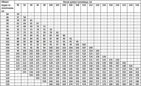 Коса довжина вимірюється від середини лопатки до кінця стегна. Дані для обчислення маси, зведені в таблицю: