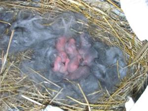Перед появою потомства кролиця починає вести себе особливим чином: вона видирає з себе пух. Цей матеріал використовується для майбутнього потомства. Завдяки йому маленькі кроленята не будуть мерзнути.
