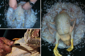 Найчастіше птахівники практикують ошпарювання тушки. Приступати до такого кроку можна через чотири години після забою.