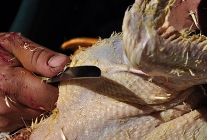 - На наступному етапі потрібно очистити шкіру від пуху. Для цього використовують тупий ніж або методику обвалювання тушки в борошні. А також можна потримати птаха над вогнем, але не більше двох хвилин, інакше весь підшкірний жир витече.
