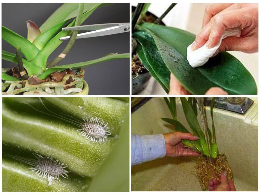 - прибрати комах з листя можна ватним тампоном, просоченим мильним розчином, подібним чином позбуваються і від псевдобульб;