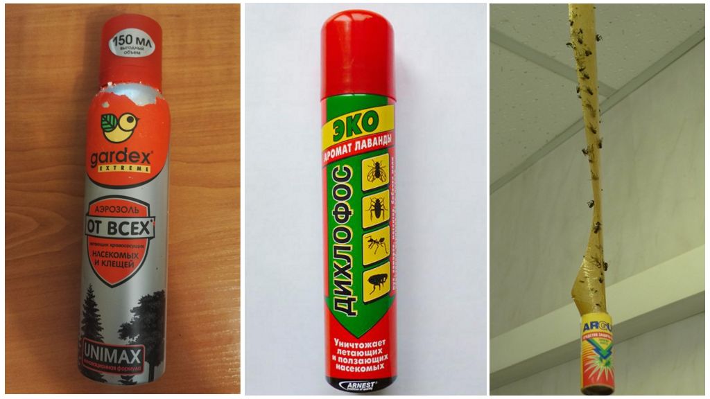 - Дихлофос – ще один інсектицидний аерозоль, яким легко отруїти плодових мошок. В якості діючих речовин засоби виступають циперметрин і тетраметрин. Склад не має запаху, ним можна труїти не тільки мошок і мух, але і комарів, ос, міль, тарганів, мурах та інших шкідливих комах. Засіб розпилюють в місцях скупчення шкідників: один балон розрахований на обробку 80 кв. м. оброблюваної поверхні. Ціна балона 100 рублів.