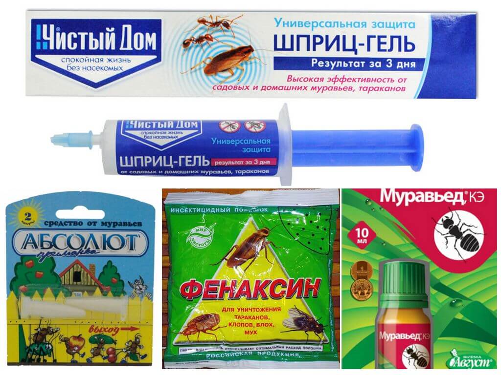 Найпопулярніші хімічні засоби: Мурацид, Муравьін, Грім-2 та ін., містять інсектицид діазинон, який відноситься до фосфорорганічних сполук, що викликають параліч у шкідників через 2-4 доби. Вони випускаються в декількох формах: гранули, таблетки, порошки, гелі або рідини;