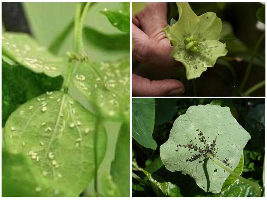 Помітити шкідників дуже просто. Необхідно перевернути листочок, оглянути стебло. Виглядає попелиця, як дрібні порошинки, що зібралися в одній частині. Якщо придивитися, можна помітити, що вони рухаються.