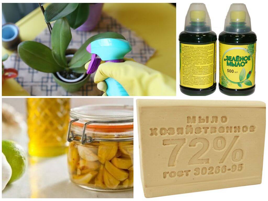- У воду додати деревну золу, мило. Обприскати листя орхідеї, грунт.