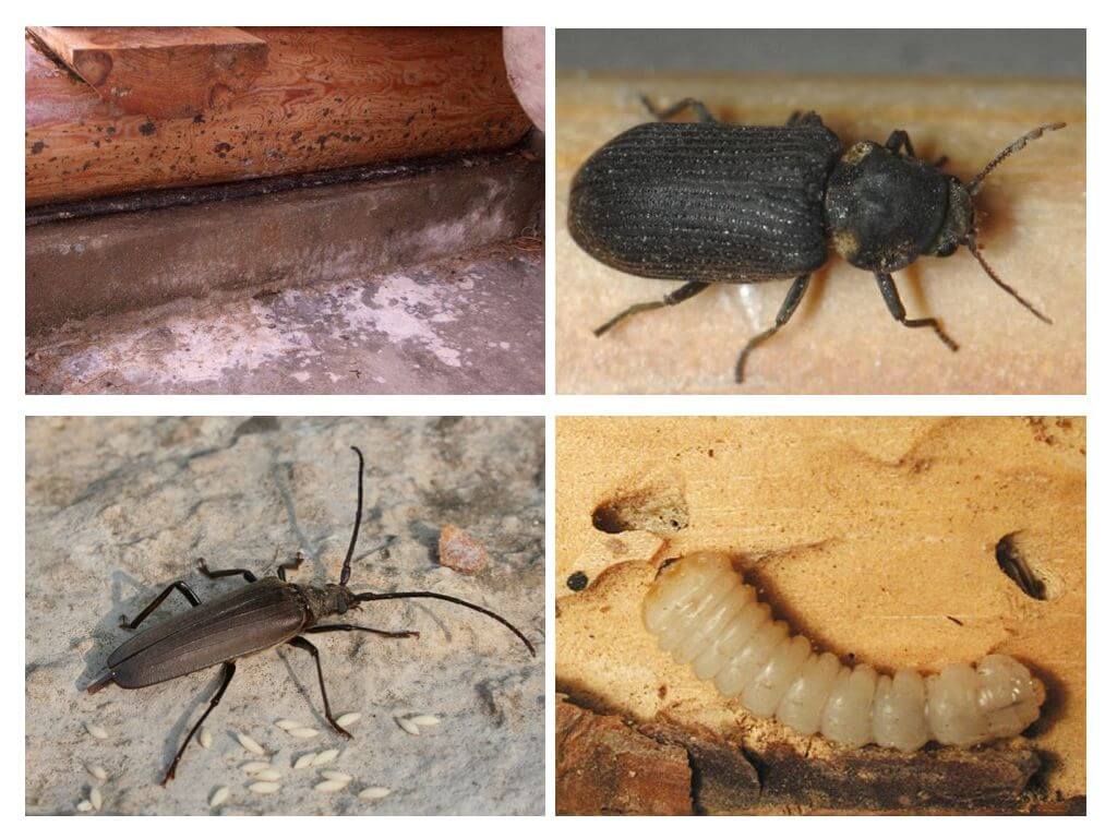 Незважаючи на те, що деревина не є дуже ситним матеріалом, знаходяться ентузіасти, які бажають нею поласувати. Мова йде про жуках усачах або як їх ще називають дровосеках, які наносять дерев’яним будівлям величезний шкоду. Видів і підвидів цих шкідників безліч – це і фіолетовий вусань, і меблевий точильник, і чорний домовик вусань. Також існують лжекороеды і сверлильщики. Всі вони пошкоджують деревину, наслідком чого стає ослаблення конструкції будинку, а іноді і його руйнування.