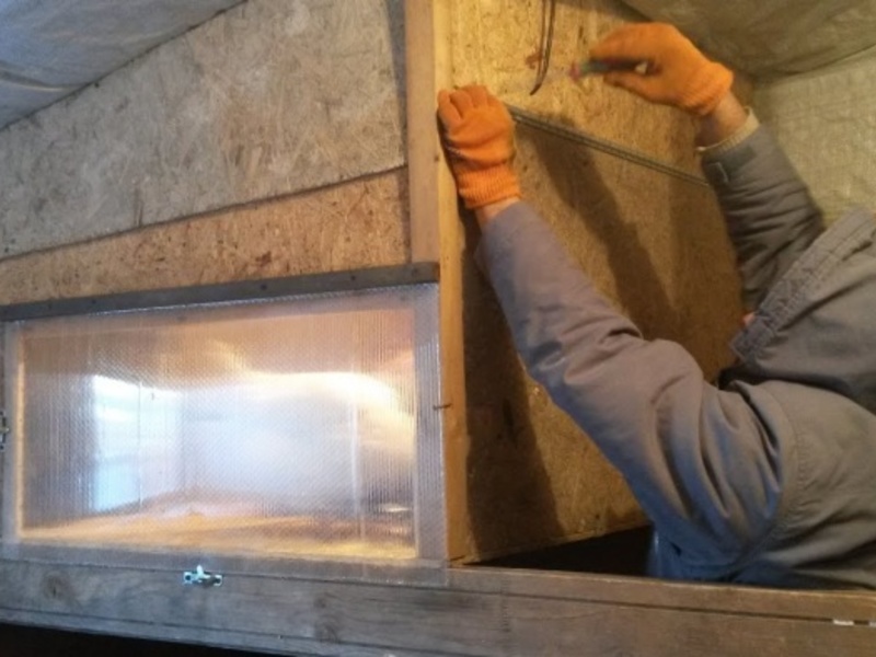Щоб зберегти тепло в холодний період, по периметру вікна фіксується прозора плівка. Вхідні двері в курник також утеплюють плівкою і повстю, для щільного прилягання до стін споруди. Всю двері зсередини обшивають щільною тканиною або старим килимом. Ці заходи допоможуть запобігти попаданню всередину протягів.