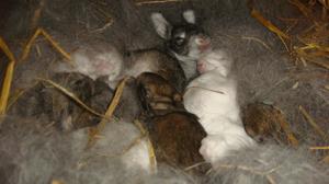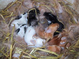 - Підготувати гніздо. Бувають випадки, коли кролиця не спорудила собі гніздо, а пологи вже починаються. У таких випадках облаштуванням маточника повинен зайнятися кролівник. Для цього потрібно вирвати пух з боків і живота самки, а потім утеплити їм гніздо.