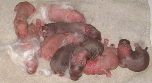 За один виводок самка зазвичай приносить від 2 до 8 дитинчат. Вони народжуються голими і сліпими, але поруч з матір’ю вони знаходяться не постійно. Самка приходить лише погодувати сисунів.