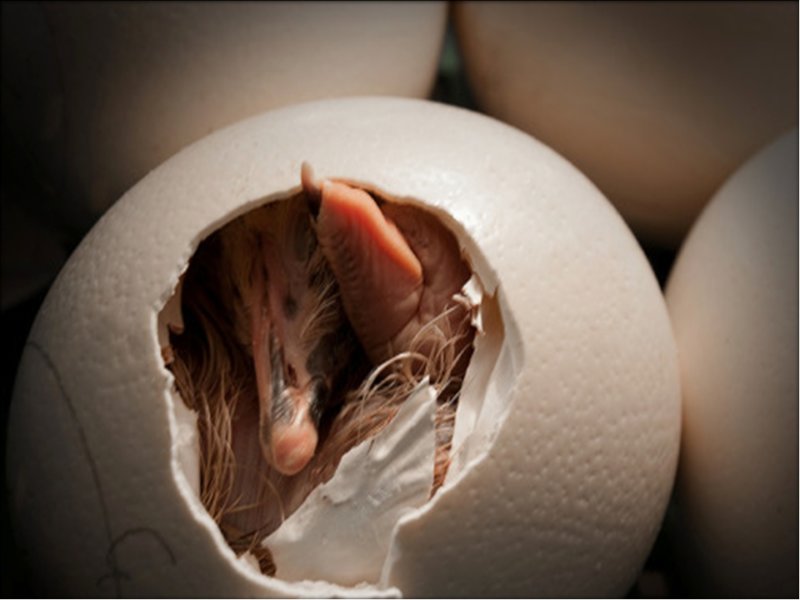 Далі, щоб зламати для себе вихід, пташеня б’є по шкаралупі потилицею. Зважаючи на це, птенчики африканських страусів з’являються на світ з гематомами на потиличній частині їх малесенькій головки, які швидко заживають.