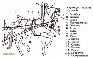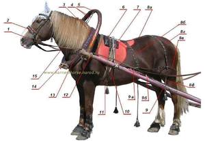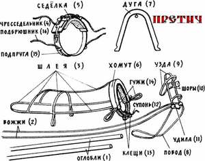 Вся конструкція дугового упряжки включає у собі: шлеї, седелкі, дуги, хомути, черезсідельник, вуздечки з віжками і подбрюшнік.