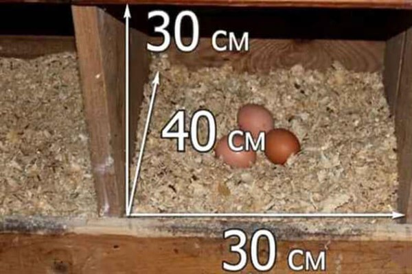 Розмір гнізда для курей теж визначається їх породою. Зазвичай висота береться 300 мм іноді для великих курей до 450 мм. По площі підстави розмір приймається від 300-400 по ширині і 300-400 по довжині.