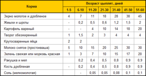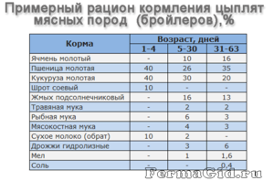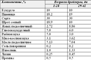В залежності від етапу зростання змінюється процентний вміст інгредієнтів. Дуже важливо правильно розрахувати необхідну кількість корму, тому що недогодівля або перегодовування призводить до проблем зі здоров’ям бройлерів і їх зростання. Наведена нижче таблиця підкаже, яке треба давати кількість корму залежно від віку.