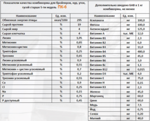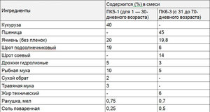 Передстартовий комбікорм маркується як ПК 5-1. Цей же корм використовується для годівлі птиці віком до 14 днів. Основним компонентом тут є кукурудза подрібнена, ще в складі є фуражна пшениця, ячмінь і горох. Завдяки цим інгредієнтів активно формуються кістки скелета, вони також позитивно впливають на роботу шлунку і кишечника пташенят. Далі бройлерів поступово привчають до стартового комбікорму ПК 5-2, тому що птахи входять у стадію інтенсивного росту. Коли бройлери досягають місячного віку, їх переводять на комбікорм ПК 6-1, яким годують вже до забою.