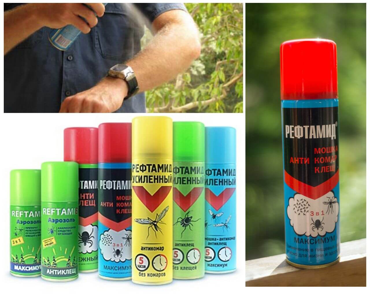 - Рефтамид Екстра Антиклещ. Універсальний засіб рекомендується використовувати від комарів, при великій їх кількості. Обробляють спреєм намети, брезенти, рюкзаки, сумки перед походом у ліс на нічліг. Наносити на шкіру не рекомендується.