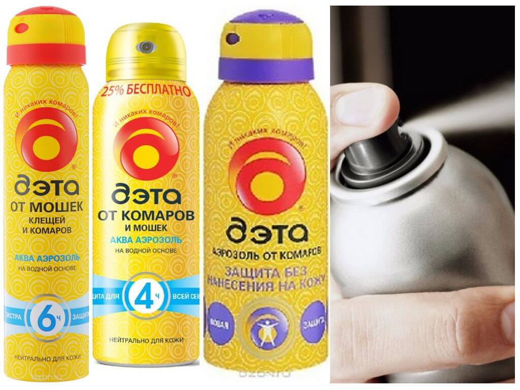 Спрей Дета від комарів має нейтральний для шкірного покриву склад на водній основі з апельсиновим запахом. Період дії близько 4 годин. Його можна розпорошувати як на шкіру, так і на одяг (на відстані не менше 15 см від оброблюваної поверхні). Ціновий діапазон варіюється в межах 120-140 рублів.