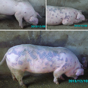 - Підгострий перебіг (кропив’янка). У свині різко піднімається температура. Апетит знижується, з’являється запор, спрага, кон’юнктивіт. Через два дні на шкірі проступають прозорі пухирі. Вони згодом стають темно-бурого кольору і концентруються на шиї, спині, боках і на голові. Розмір пухирів від 1×2 см до 3×4 см і більше. Як тільки з’являються пухирі, стан свині поліпшується. Якщо хвороба доброякісна, плями бліднуть.