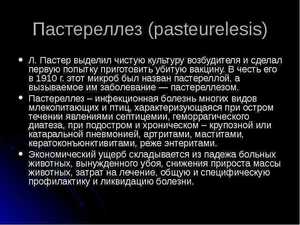 Пастерельоз — небезпечне інфекційне висококонтагіозна захворювання, яким хворіють багато видів сільськогосподарських тварин, а також їх дикі побратими. Пастереллезом може заразитися і людина. Хвороба відома давно, але вперше збудник був виділений і вивчений французьким мікробіологом Луї Пастером в 1880 році. На честь видатного вченого збудник був названий пастереллой, а хвороба, яку він викликає, — пастереллезом.