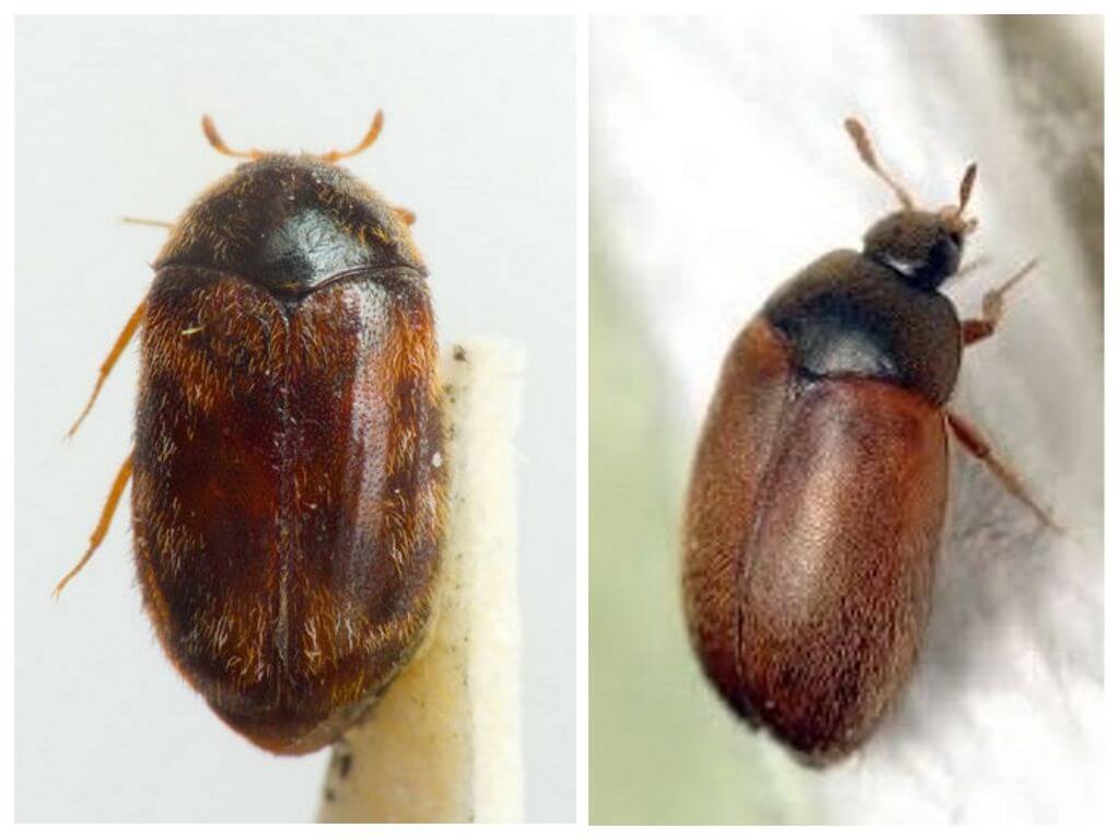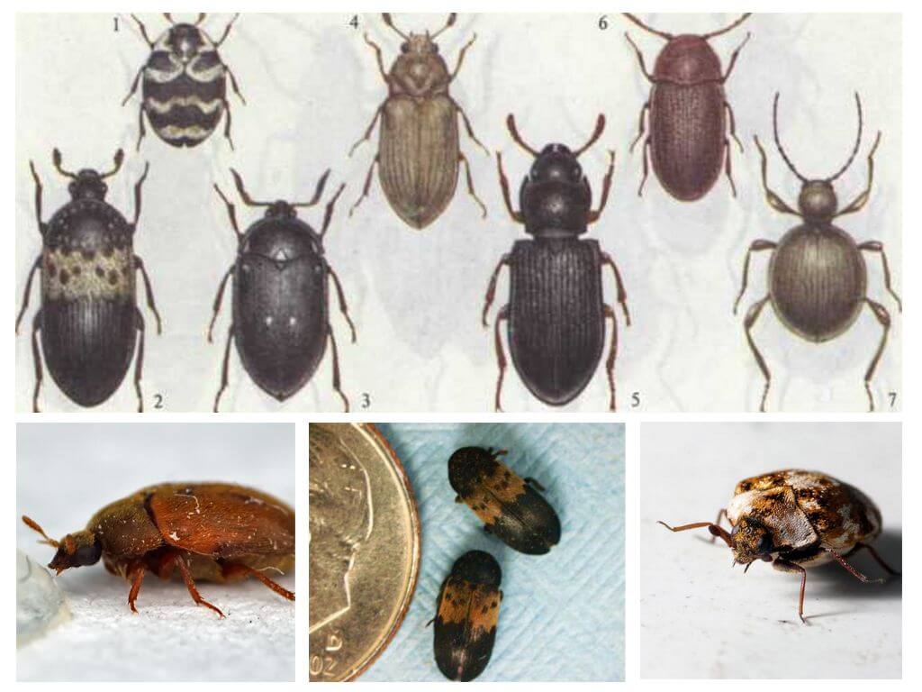 Фото кожееда Смирнова демонструє дорослу особину і личинки на різних стадіях розвитку.