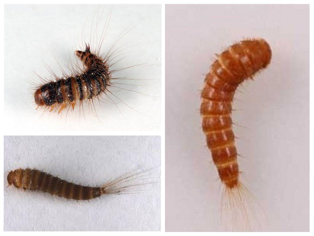 Личинка жука кожееда – червеобразная з вираженими волосинками різної довжини на тілі і пензликом з прямих жорстких волосся на останньому членику. Личинка активно харчується, пошкоджуючи всі види органічного субстрату – шерсть, волосся, пір’я, шкіру, крупи, зерно, ковбаси, сухе молоко та ін. Гастрономічні переваги не обмежуються органікою. При відсутності поруч звичної їжі може поїдати синтетичні матеріали. Личинки швидко і активно рухаються. Воліють селитися в ворсистою, шорсткої тканини.