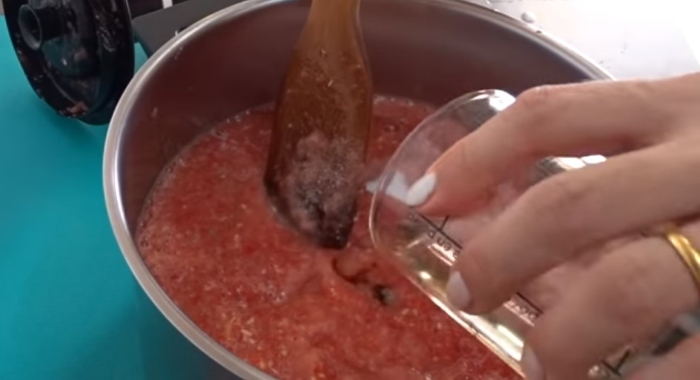 2. У помідорно-часникову масу відправляємо цукровий пісок, олію, солимо за смаком. Все досконально перешиваємо і ставимо варитися на 15-20 хвилин після початку активного кипіння напівфабрикату.