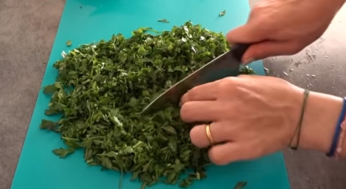 4. Петрушку, попередньо вимиту і обсушену, дуже дрібно шаткуємо.