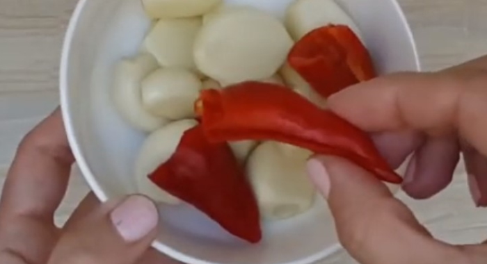 3. Часник очищаємо від грубої лушпиння, у чилі зрізаємо плодоніжку і прибираємо насіння.