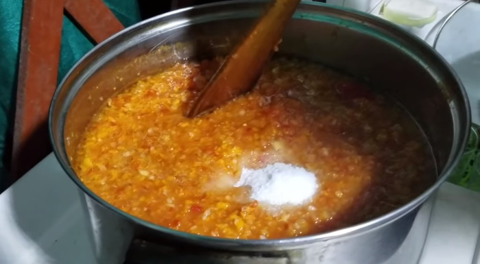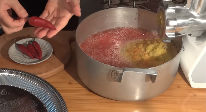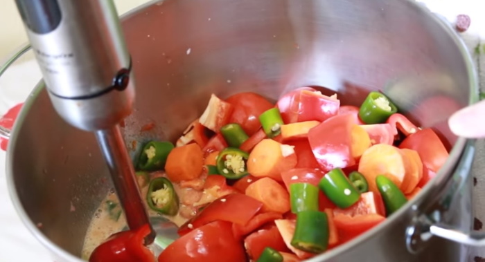 1. Всі овочі, крім часнику, нам потрібно подрібнити до пюреобразного стану, перелити суміш у жароміцну каструлю і поставити на плиту. Як вчинити з гострим перцем, вирішувати тільки вам. Якщо бажаєте отримати більш гостре блюдо, то слід використовувати цілісні стручки, у яких зрізана лише плодоніжка. Для більш м’якого смаку потрібно з м’якоті видалити насіння, в яких і міститься основна гострота овоча.