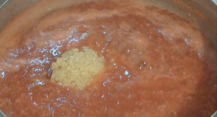 4. Коли соус дійде до точки кипіння, потрібно зменшити напругу полум’я і проварити напівфабрикат, періодично перемішуючи, не менше 25 хвилин. Після того, як час мине, в ароматну суміш вливаємо оцет і кладемо подрібнену через блендер часник. Все добре перемішуємо і даємо проваритися ще сім хвилин.
