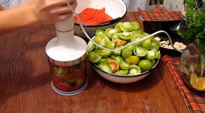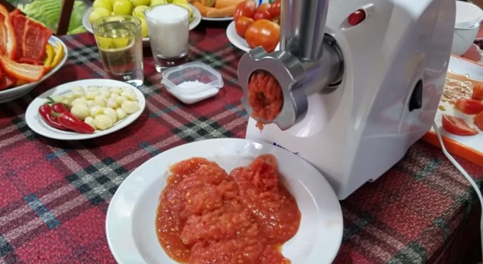 1. Плоди томата і стручки перцю промиваємо, вирізаємо плодоніжки, стручки розрізаємо на дві половини і видаляємо насіння. Підготовлені до подальшої переробки овочі перетираємо в пюреподібний складу будь-яким зручним для вас методом.
