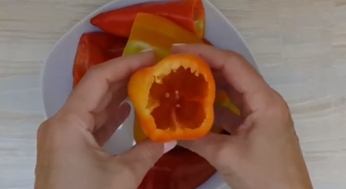 2. У перців зрізаємо верхню частину, до якої кріпиться плодоніжка, а з порожнини вичищаємо перегородки, на яких тримаються насіння.