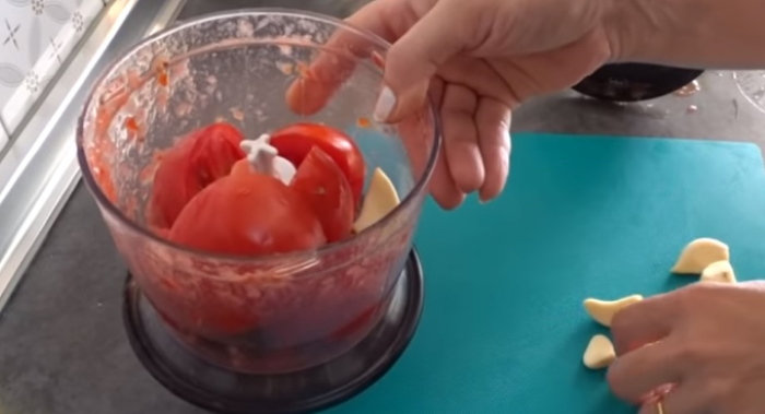 1. У блендері подрібнюємо помідори і часник, перевалюємо отриману суміш в жароміцну ємність.