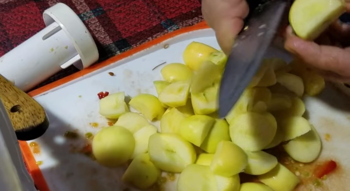 3. Фрукти обмиваємо від піску і можливої бруду, зрізаємо з серцевини м’якоть, яку пропустимо через м’ясорубку і додамо до заготівлі. Посудину ставимо на варильну поверхню, включаємо велике полум’я і періодично розмішуючи суміш, доводимо її до температури кипіння і варимо на маленькому вогні без кришки 2 години.