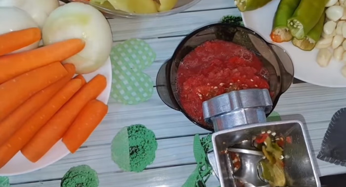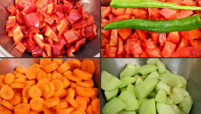 1. Морква, цибуля, болгарський перець, томати і яблука добре промиваються, нарізати на великі фрагменти і перекручуються через м’ясорубку або кухонний комбайн.
